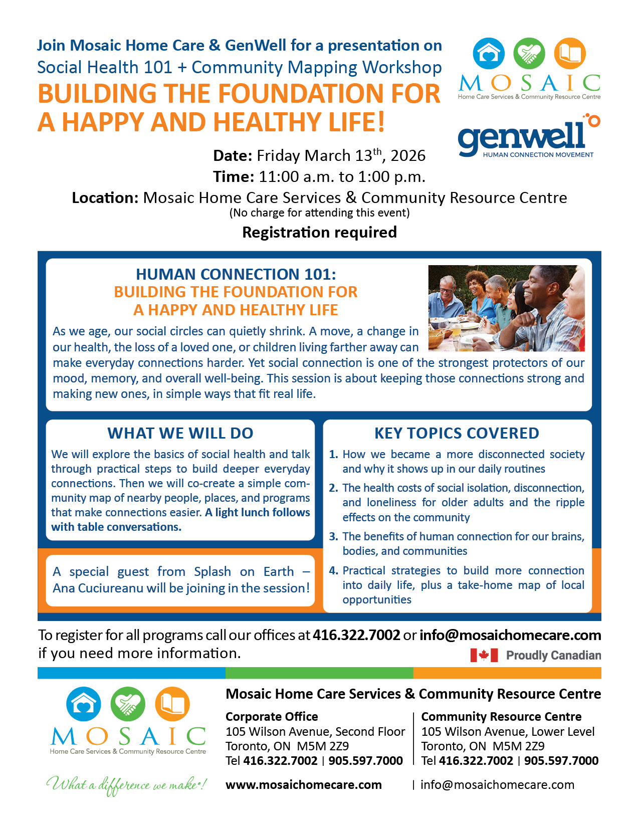 Join Mosaic Home Care & GenWell for a presentation on Social Health 101 +Community Mapping Workshop for Building the Foundation for a happy healthy life!